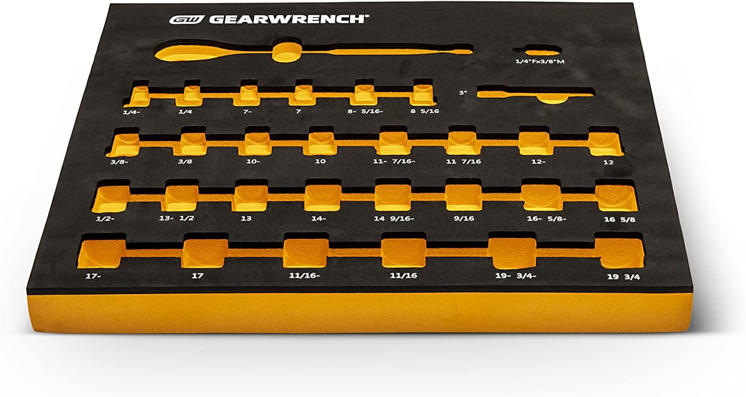 Our modular tool sets consist of multi-piece assortments of quality GEARWRENCH tools, each organized in a sturdy EVA foam tray. The chemical and solvent resistant trays are designed in multiple modular sizes to fit perfectly with a range tool storage systems. This modular design allows users to customize their own toolkit and storage system. Sets feature components selected to provide a complete range of specific tools, each nested in a custom cutout that protects while keeping tools organized and accessible. Trays are orange and black with high visibility size markings for quick tool identification.